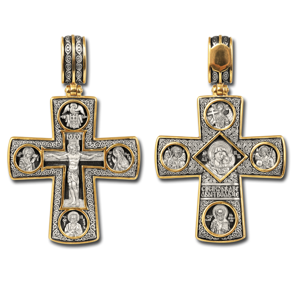 ![]() | Распятие Христово с предстоящими. Святая Троица. Архангел Михаил. Св. Воины. Тихвинская икона Божией Матери. Православный крест Артикул: 08199 Вес: 22,5 гр. Серебро 925, позолота. Цена: 9225 руб. КУПИТЬ | |